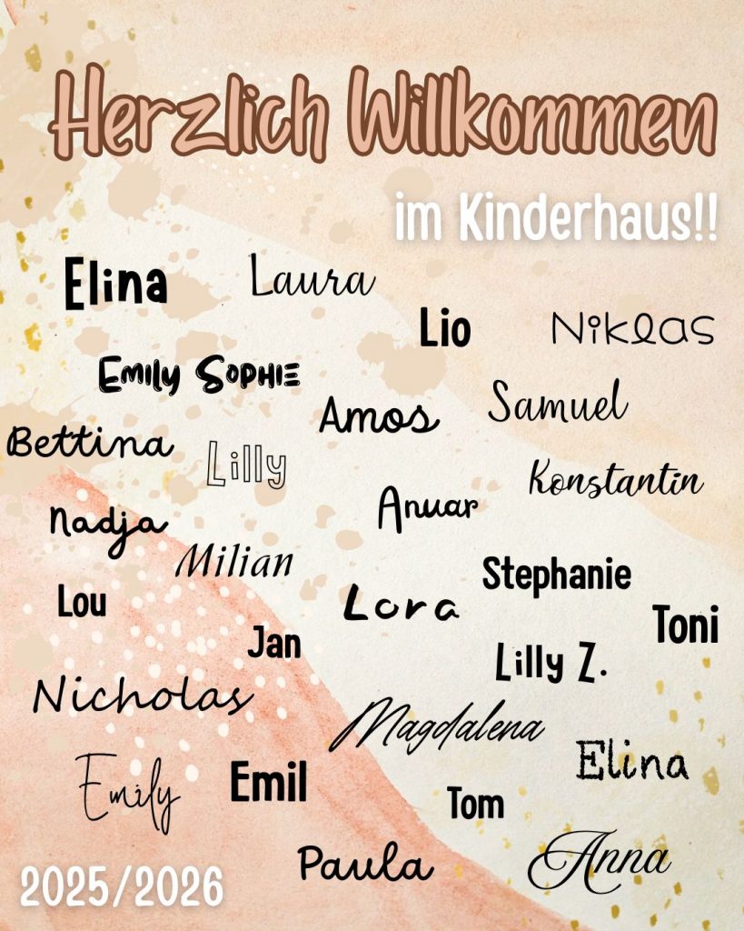 Auch unsere neuen Kindergartenkinder heißen wir herzlich willkommen: Elina, Emily Sophie, Lou, Samuel, Nadja, Lilly, Konstantin, Amos, Lora, Anuar, Nicholas, Jan, Magdalena, Tom, Toni, Elina, Emily, Simon, Aurora, Aria, Leni, Joseph, Ilyana und Marie .